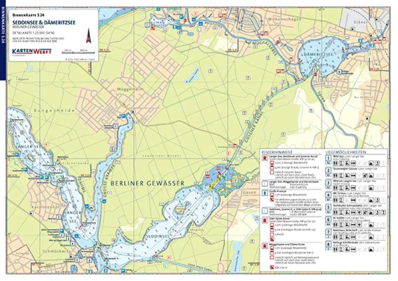 Die hochwertig laminierten BINNENKARTEN 3.23 / 3.24 umfassen die Müggelspree von Köpenick bis Erkner sowie die Dahme bis Schmöckwitz mit Müggelsee, Langer See, Großer Krampe, Seddinsee, Gosener Kanal und Dämeritzsee im detaillierten Maßstab.