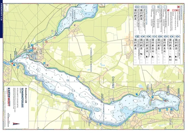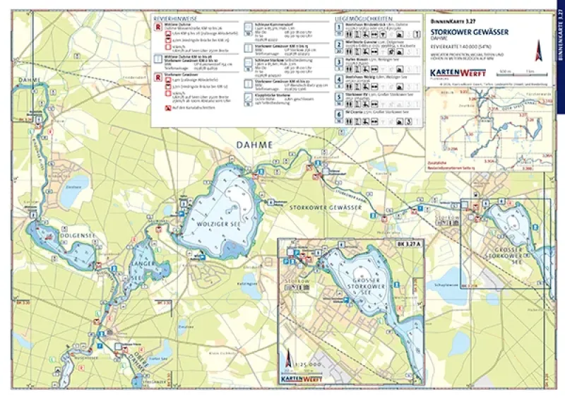 Die hochwertig laminierten BINNENKARTEN 3.27 / 3.28 umfassen die Dahme von Bindow bis Prieros mit Dolgensee sowie die Storkower Gewässer mit Langer See, Wolziger See, Großer Storkower See und Scharmützelsee im detaillierten Maßstab.