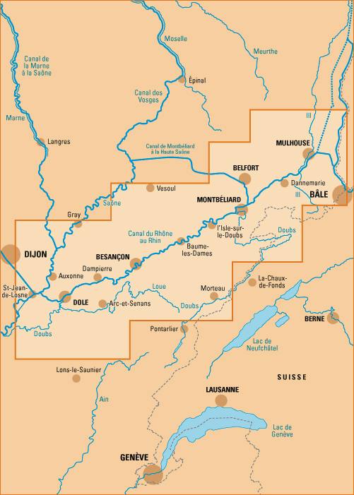 Der Rhein-Rhône-Kanal ist ein Verbindungskanal, der aus mehreren Abschnitten besteht: Zunächst befahren Sie die künstlich angelegte Strecke zwischen Saint-Symphorien und Dole, dann den kanalisierten Fluss Doubs bis Voujeaucourt, und schließlich einen weiteren künstlich angelegten Abschnitt mit Scheitelstrecke von Voujeaucourt bis zum Rhein.