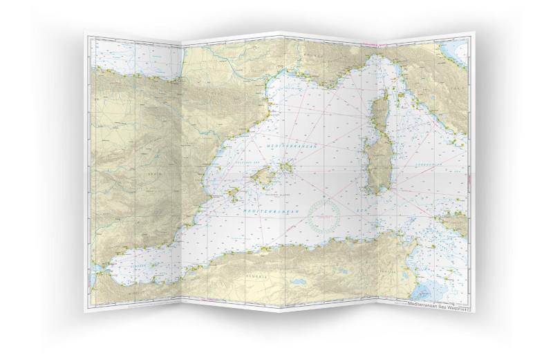 Vorderseite Tyrenisches Meer, Adria, Ionische See und Gewässer südlich von Sizilien bis zur Küste von Tunesien im Maßstab 1: 1,75 Mio. Rückseite Westliches Mittelmeer von Gibraltar bis Palermo (Sizilien) im Maßstab 1: 1,75 Mio. In beiden Karten sind die für eine Passageplanung wichtigen Feuer sowie Routen inklusive Distanzen eingezeichnet.