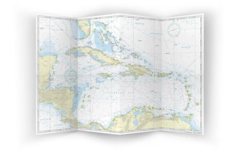 Vorderseite mit US Ostküste von Nova Scotia bis Miami. Bermuda Inseln sind enthalten. Maßstab 1:3,0 Mio. Auf der Rückseite Karibische See mit Bahamas, Antillen, Nordküste Südamerika, Panama, Ostküste Mittelamerika bis Cancun und der Südspitze von Florida bis einschließlich Fort Myers. Maßstab 1:3,0 Mio.