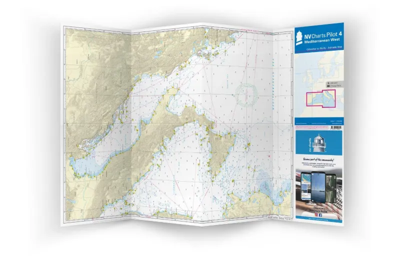 Vorderseite Tyrenisches Meer, Adria, Ionische See und Gewässer südlich von Sizilien bis zur Küste von Tunesien im Maßstab 1: 1,75 Mio. Rückseite Westliches Mittelmeer von Gibraltar bis Palermo (Sizilien) im Maßstab 1: 1,75 Mio. In beiden Karten sind die für eine Passageplanung wichtigen Feuer sowie Routen inklusive Distanzen eingezeichnet.